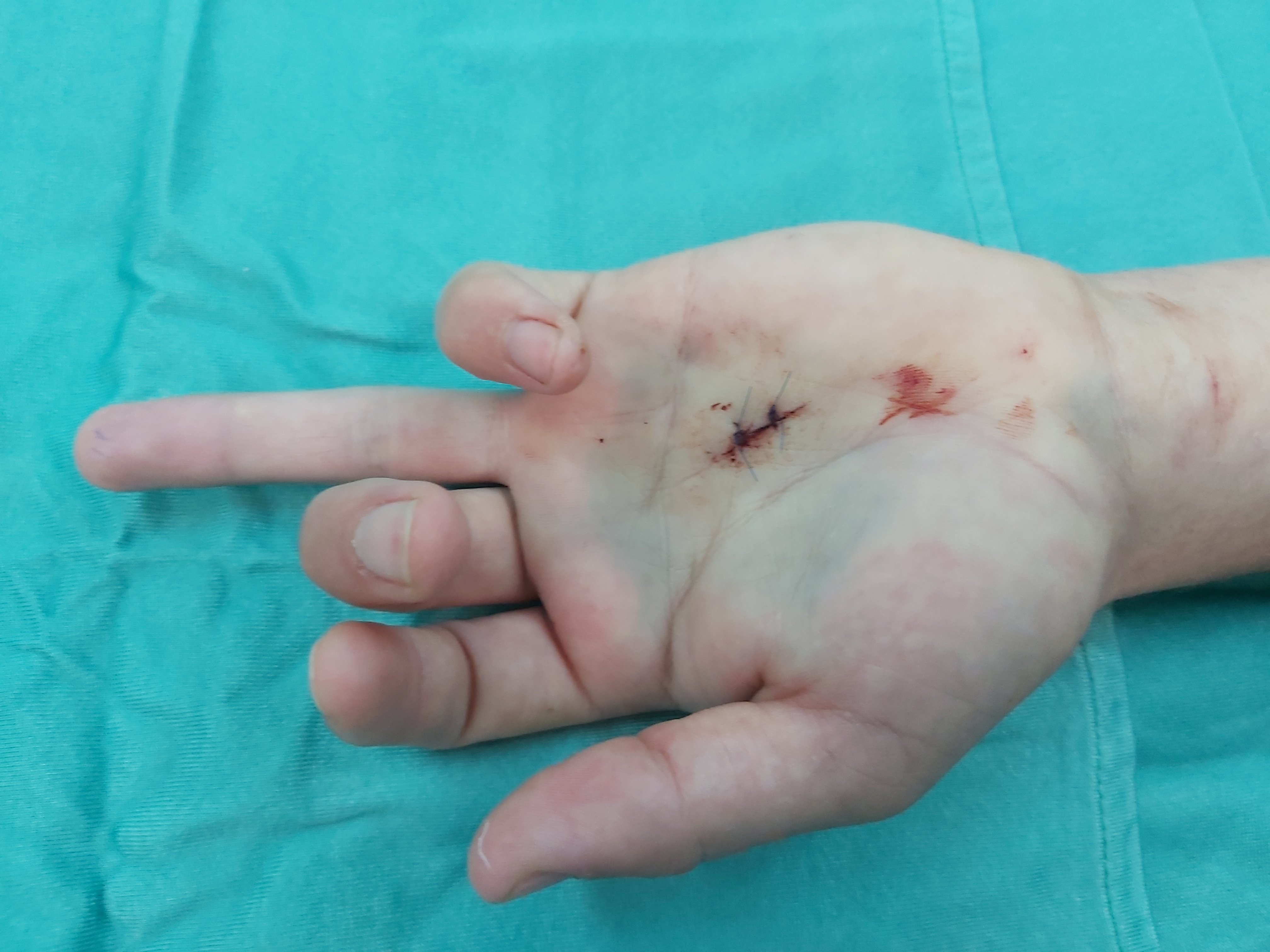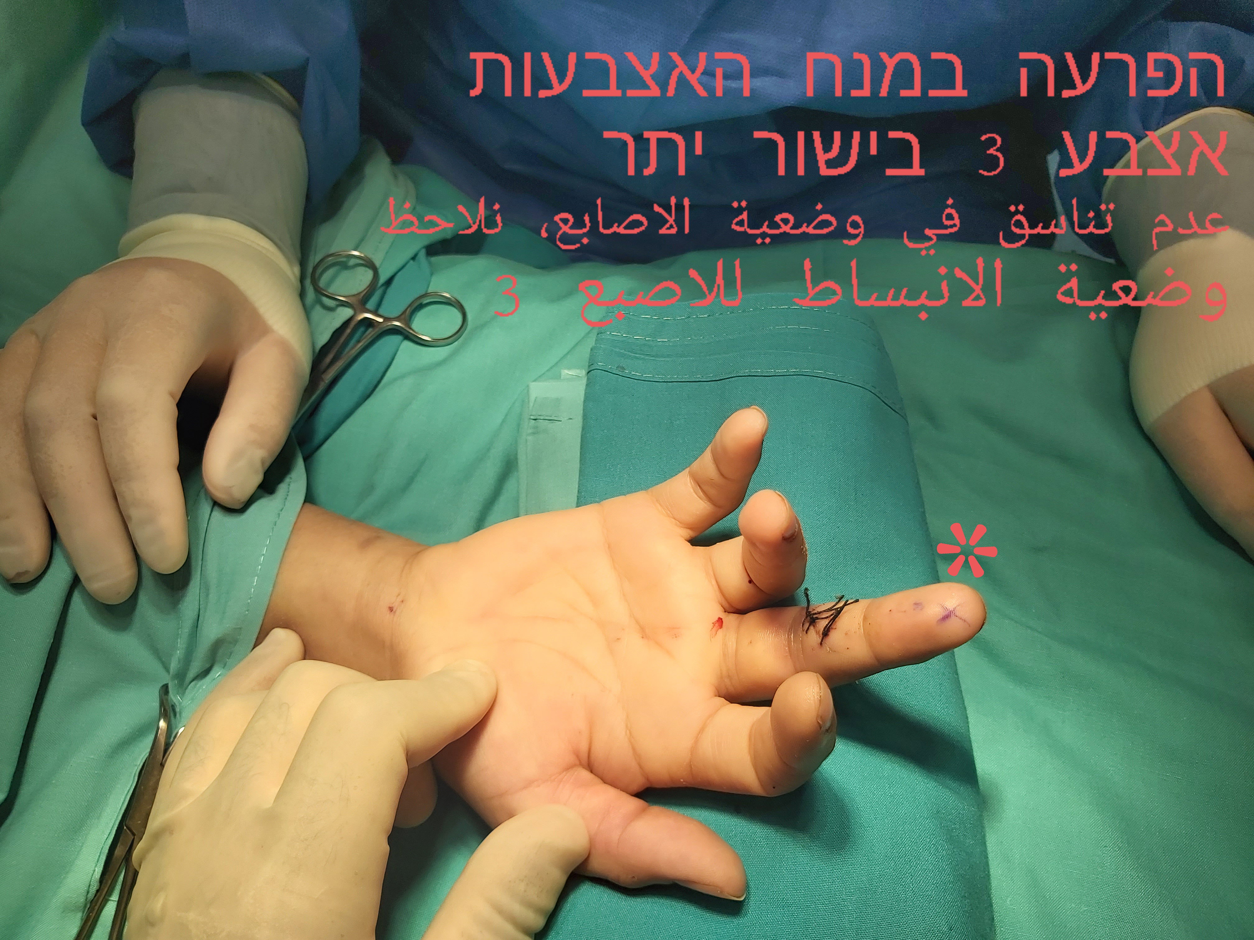 • ניתוח גידים מכופפים:גידים חתוכים אינם יכולים להחלים מעצמם, המתח בגיד גורם לשני קצוות הגיד להיפרד – לעתים עם פער של מספר סנטימטרים ביניהם.ללא טיפול ניתוחי אין כל סיכוי לחזרה של תפקוד האצבע. הניתוח לרוב מבוצע תחת הרדמה כללית או מיקומית WALANT. החתך המקורי מורחב על מנת למצוא ולזהות את קצוות הגיד הפגוע, והגיד נתפר. בגמר הניתוח היד מושמת בסד גבס כאשר שורש היד והאצבעות כפופות מעט – על מנת להגן על התיקון.